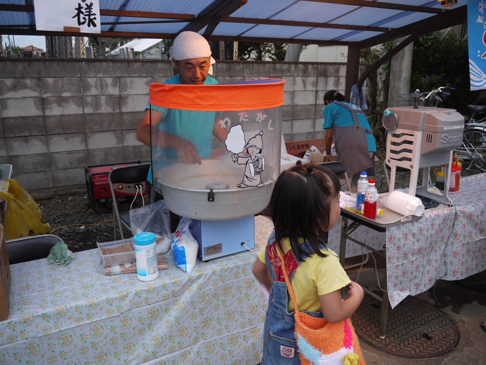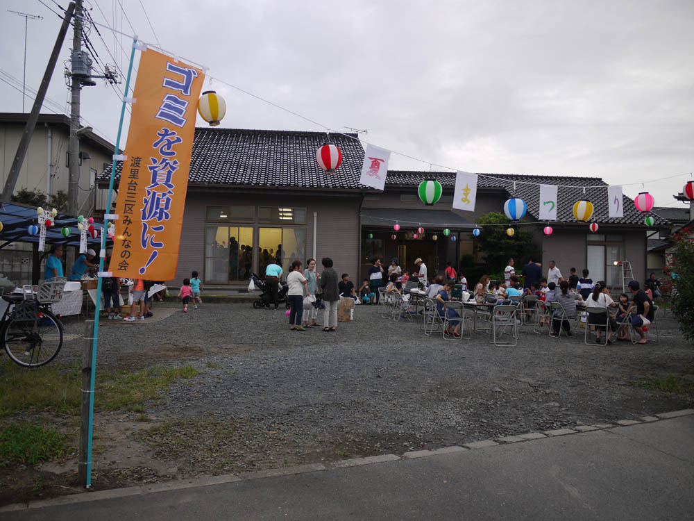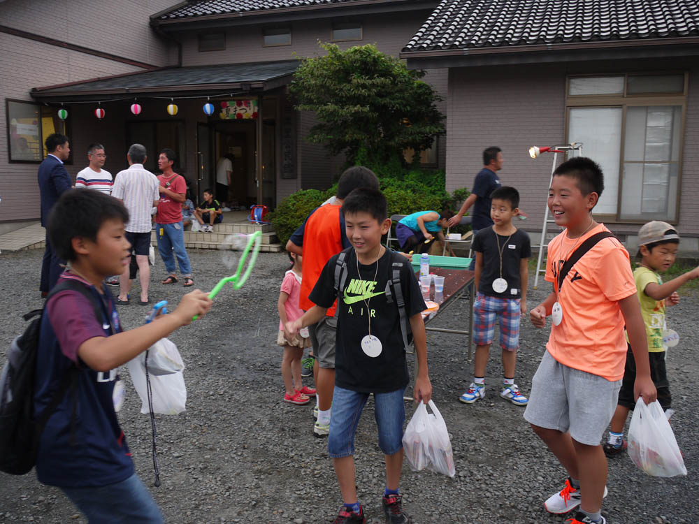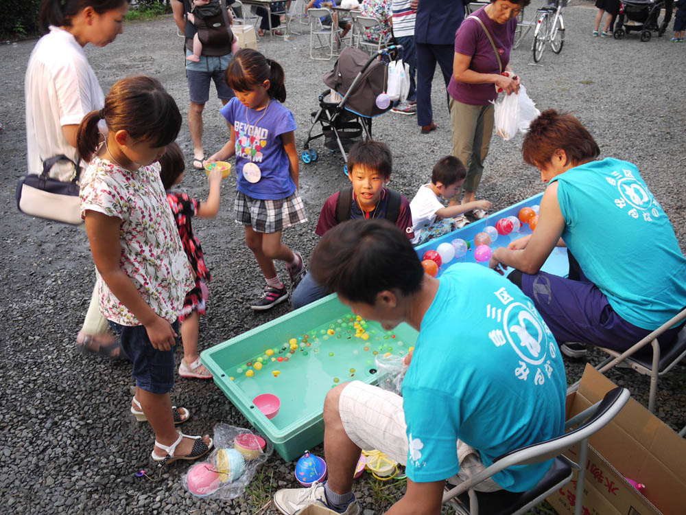子供会から資源ごみ回収などの事業を引き継いでいる、台三区みんなの会が主催する「夏まつり」が、昨晩の5時より台渡里公民館にて開催されました。昨年と同様に、「水ヨーヨーつり」、「スーパーボールすくい」、「ジャンボしゃぼんだま」を屋外で、「しゃてき」、「ペットボトルボウリング」、「わなげ」は屋内で準備されました。たべものも「やきそば」、「かきごおり」、「ふらんくふると」、「チョコバナナ」、「わたあめ」、「ポップコーン」が用意され、飲み物も冷たい「むぎちゃ」を各テーブルに用意しました。5時から7時での開催ということでしたが、昨年までと違って皆さんの出足が早く6時過ぎには満員状態となりました。子どもたちだけが参加できるゲームの商品も次々と手渡され、6時30分には品切れとなりました。子供たち用に用意したパスポート代わりのネームプレート80枚も底をつき、ご両親などの大人も含めると100数十人の人出となる忙しい催しとなりました。7時からの花火を楽しんで夏まつりも終了となり、ゲームでゲットした賞品と焼きそばなどのお土産を手にそれぞれの家路へとつきました。我々関係者も後片付けを急ぎ、8時前に全てを終了して解散となりました。